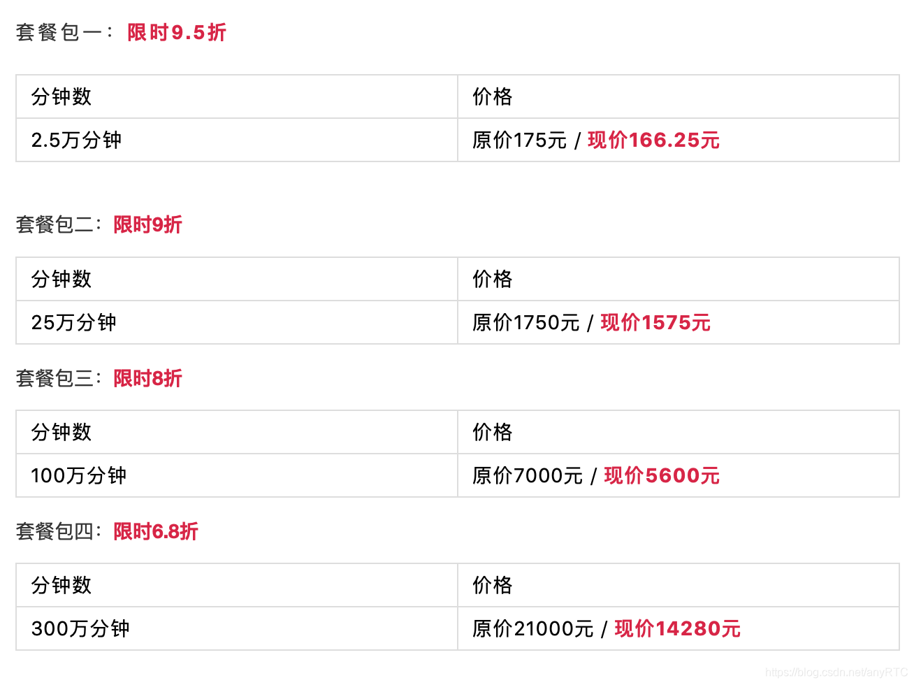 anyRTC为各位开发者们准备了4种限时折扣套餐包,各位开发者可以根据自己的用量选择合适的套餐包,享受最大程度的优惠。